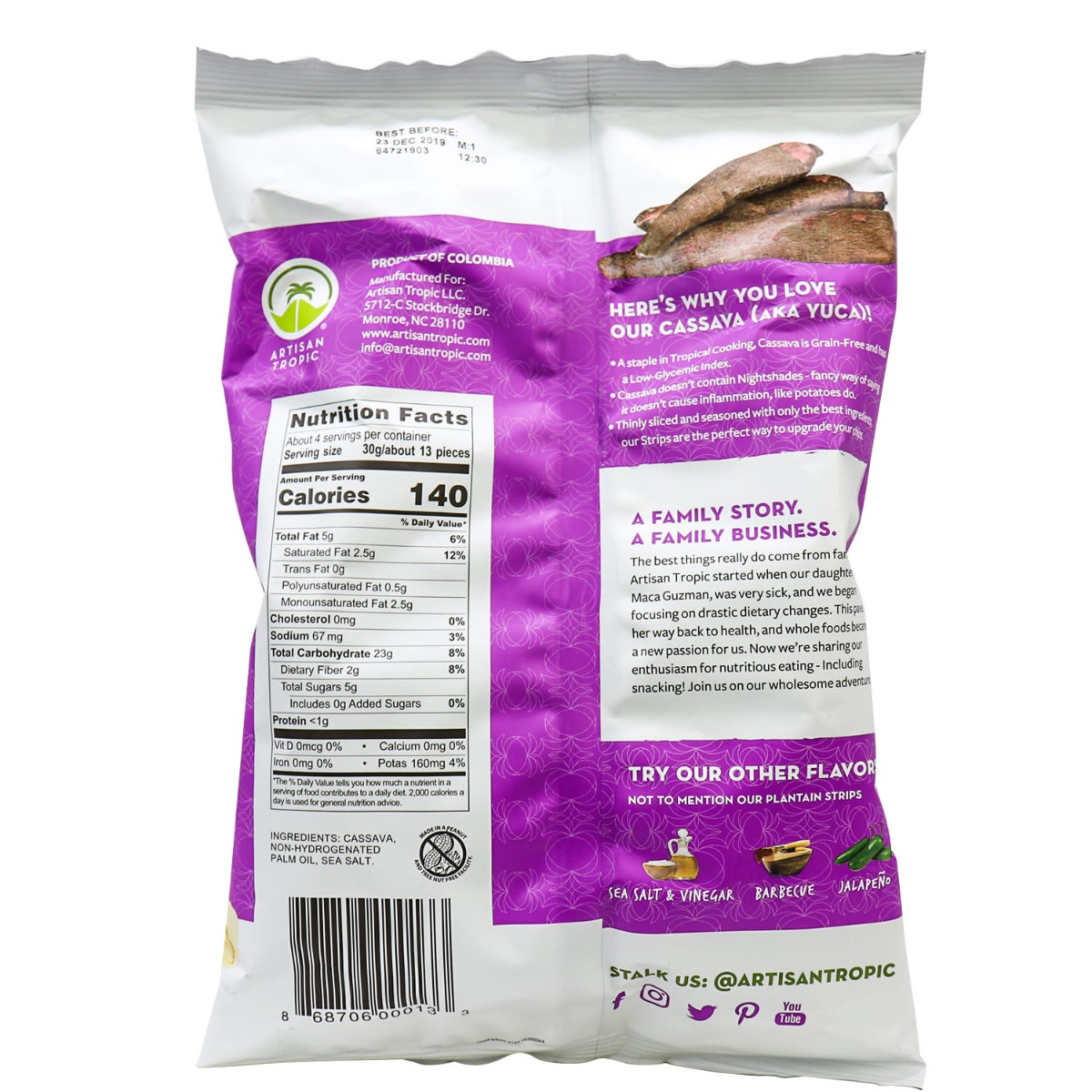 Artisan Tropic Sea Salt Cassava Strips are a taste unlike any other. Unlike potato chips, cassava strips are more fibrous, giving each bite a fuller snacking experience. Because of the long strip cut they have, they are perfect for dipping in guacamole or salsa. And no worries, we use Sea Salt to provide you with more beneficial minerals!