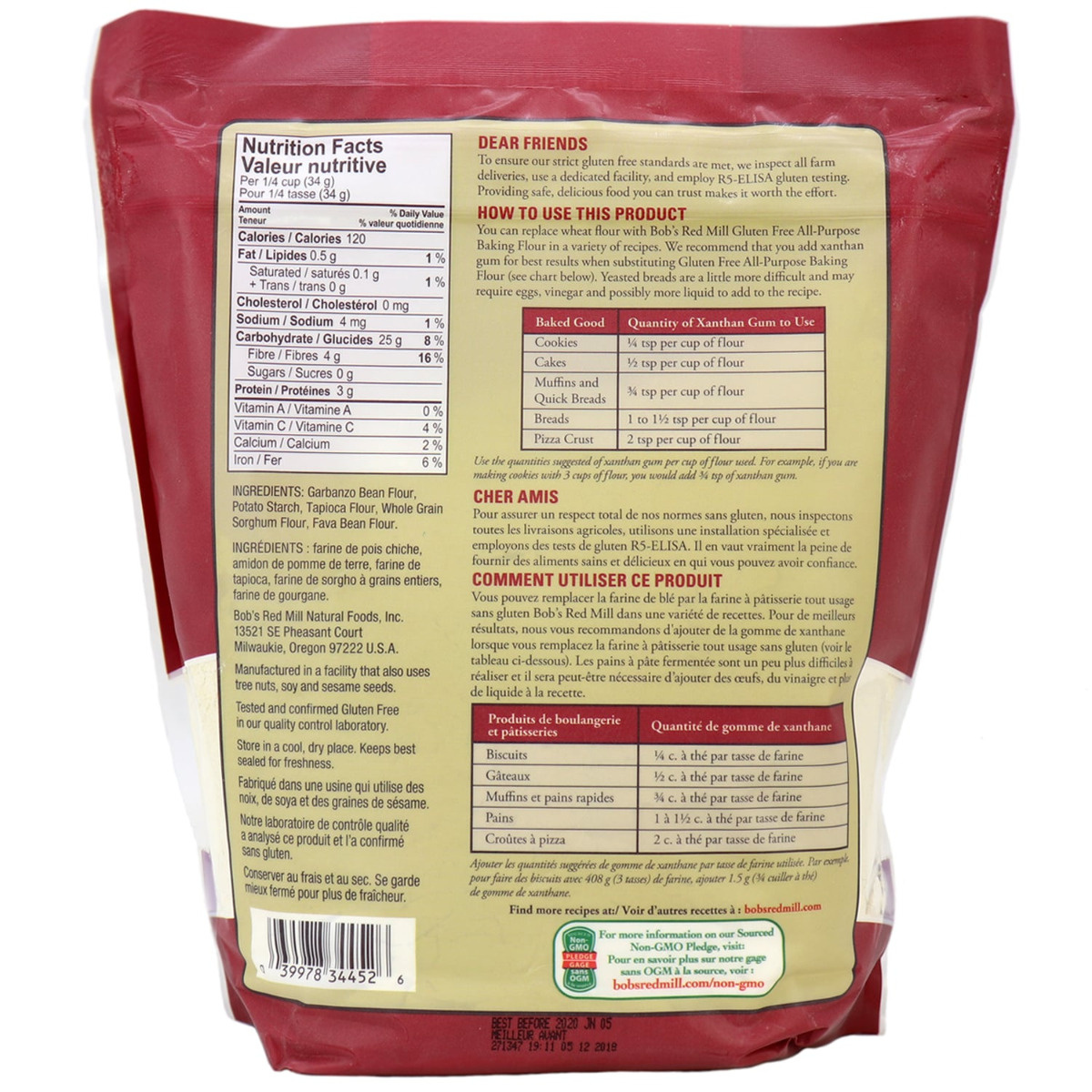 Looking for a gluten-free flour that can do it all? Then, Bob's Red Mill Gluten-Free All-Purpose Baking Flour is For You! Made with a blend of garbanzo bean flour, potato starch, whole grain white sorghum flour, tapioca flour, and fava bean flour, this gluten-free flour is highly versatile and essential for all gluten-free bakers. Expertly formulated, you won't need any additional ingredients or gums to make the food of your dreams. From cookies to pancakes to bread, this nutritious gluten-free flour serves 10% of your recommended daily fibre and plenty of nutrients from the whole grains without changing the texture or flavour. Now, that's baking without compromise!