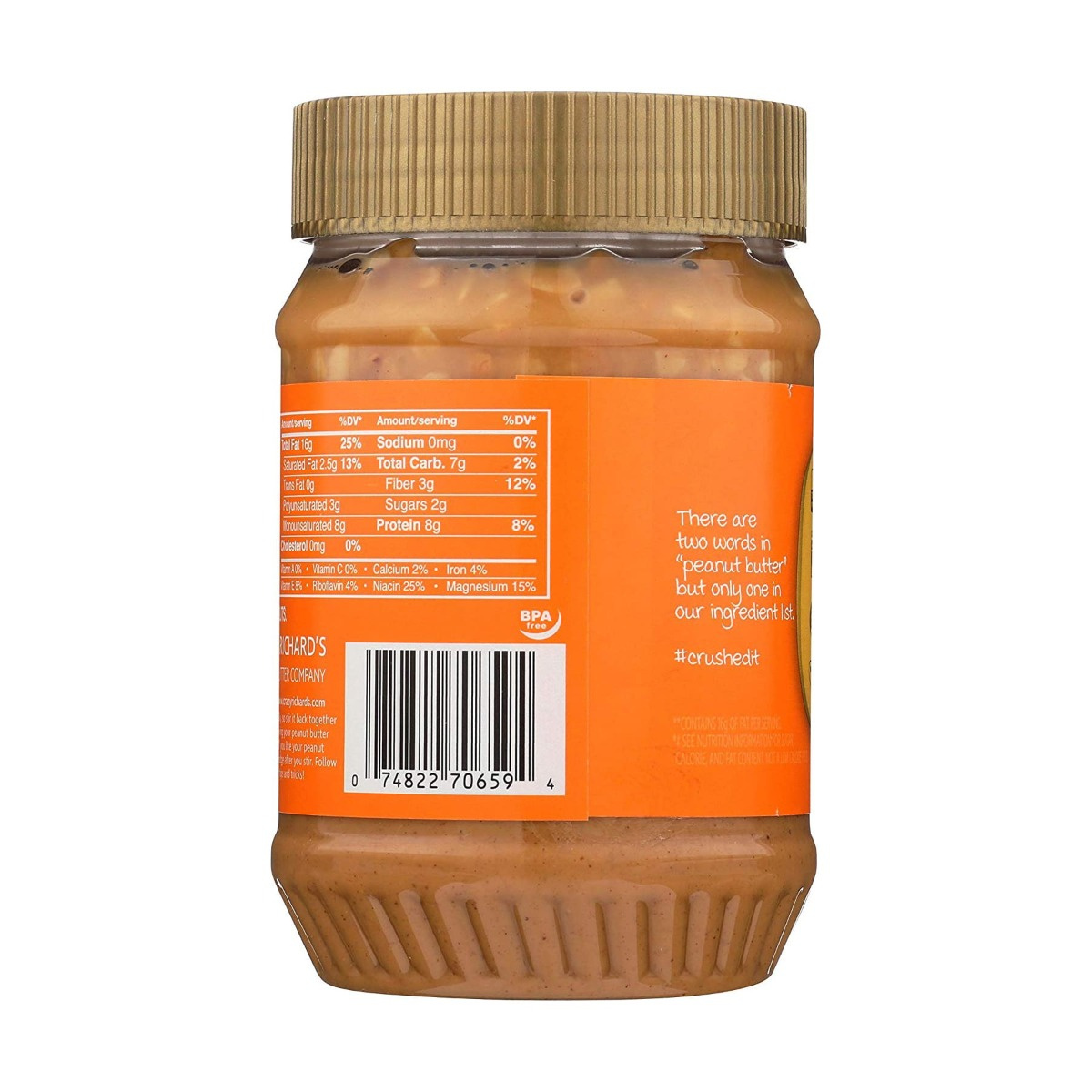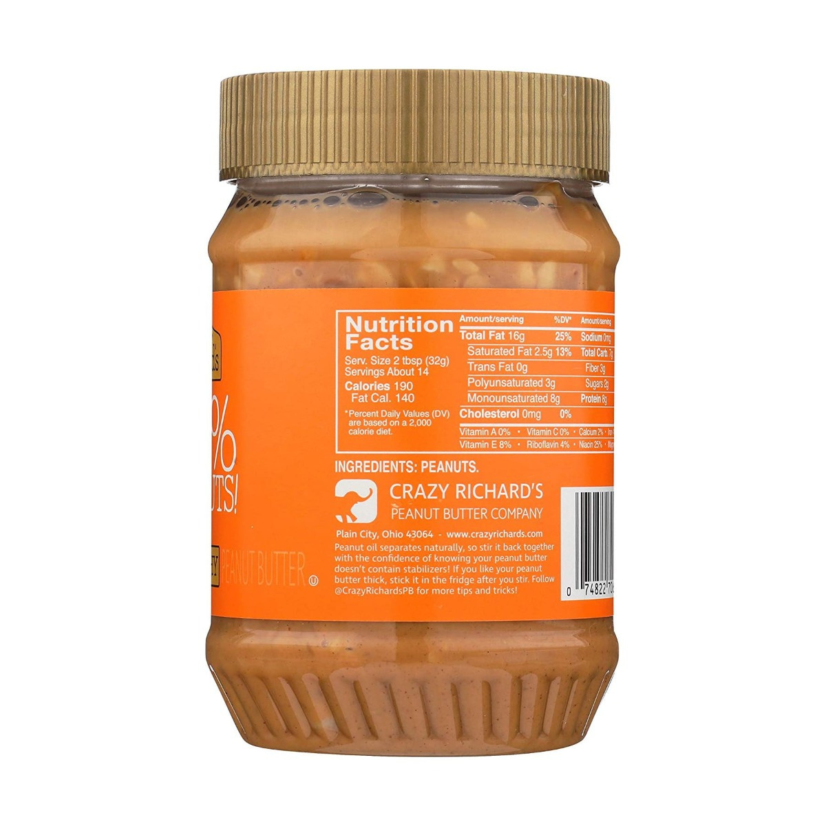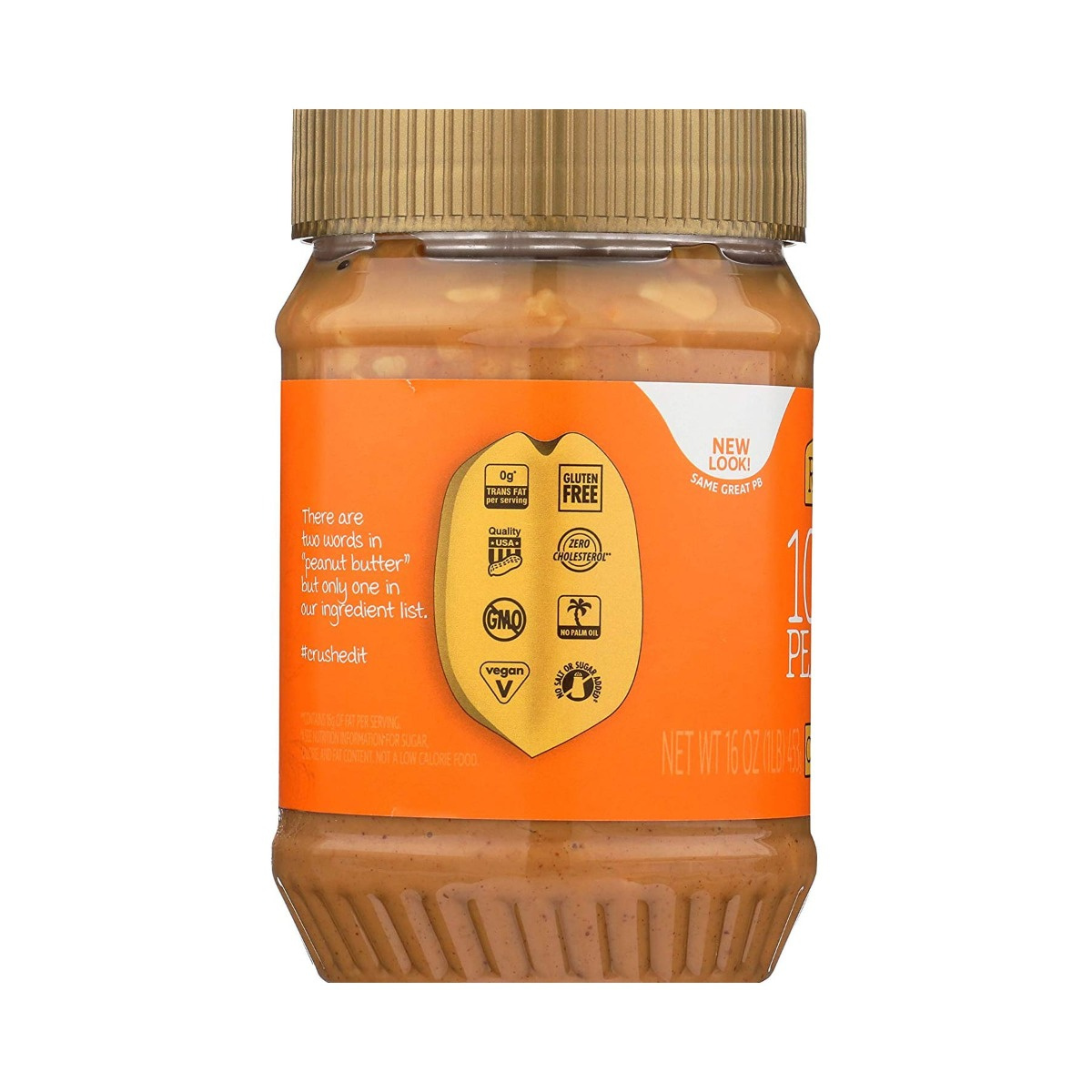 Only one ingredient: Dry Roasted and Ground to Perfection Peanuts. Our Peanut Butter only contains the best tasting peanuts to pack the biggest punch of peanut flavor.