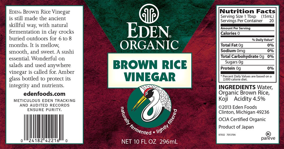 Eden Organic Brown Rice Vinegar is a refreshing and versatile seasoning. It is full bodied without the sharpness usually associated with vinegar. In cooking, brown rice vinegar helps to balance salt and adds interest by providing a stimulating contrast of flavors. Use it as you would any other fine vinegar. It is an excellent condiment sprinkled over vegetables and grain. Excellent on salads.