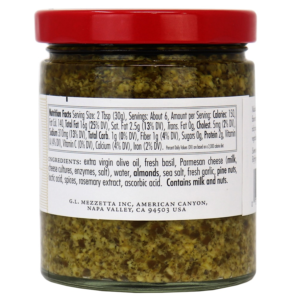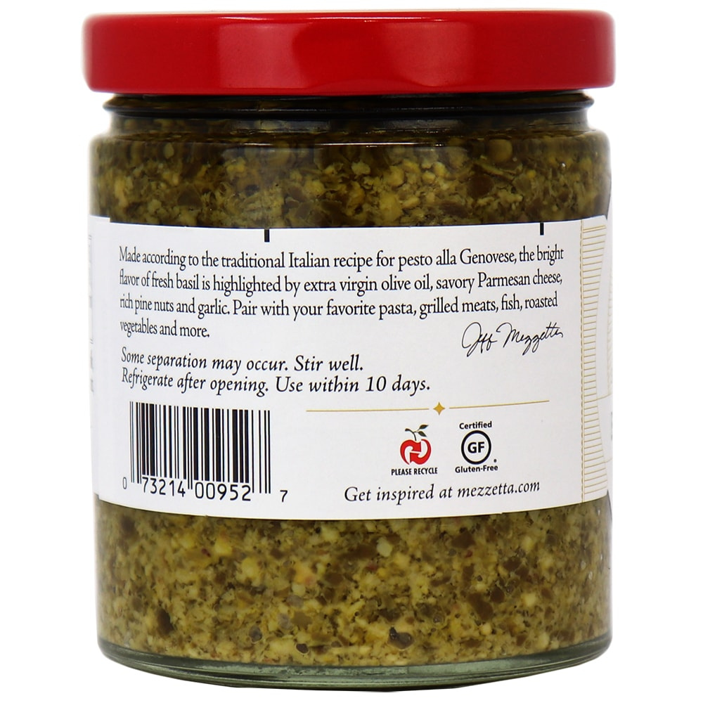 Made according to the traditional Italian recipe for Pesto alla Genovese, Mezzetta’s Basil Pesto highlights the bright flavor of fresh basil with extra-virgin olive oil, savory Parmesan cheese, rich pine nuts and garlic.