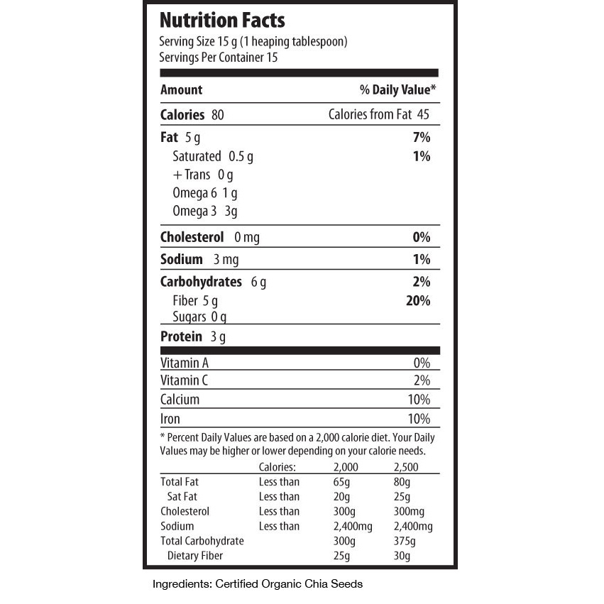 A gluten free superseed, chia seeds are a source of Calcium and Iron, a high source of Fiber, and provide 3 grams of vegetarian Omega-3 per 1 heaping tablespoon 15 gram serving. Chia seeds also contain protein, essential vitamins and minerals and a host of antioxidants, giving them an ORAC value of 1,200 per 1 heaping tablespoon 15 gram serving. The ORAC value is a measurement of the antioxidant capacity of different foods. It is said that Aztec warriors would consume a mixture of Chia and water during hunting trips to ensure stamina and endurance. These mild, nutty seeds are a fast and simple way to enhance your daily diet with an extra boost of dense superfood nutrition.