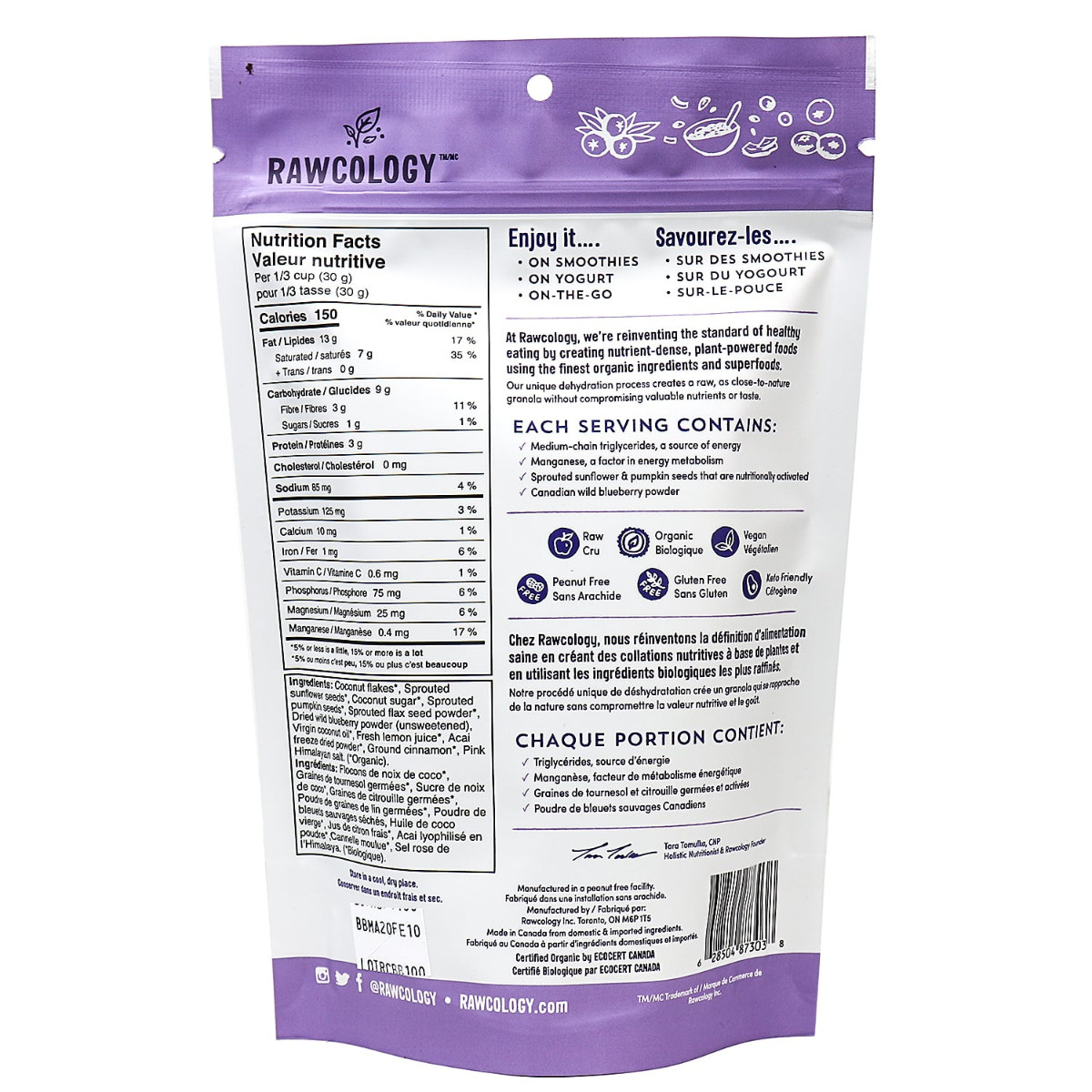 Rawcology's paleo-friendly Blueberry with Acai Granola is certified organic, grain-free, gluten-free, and nut free. It’s packed with coconut flakes, sprouted sunflower and pumpkin seeds, and lightly sweetened with coconut sugar, a low-glycemic sweetener. Superfood ingredients include Canadian wild blueberry powder and sprouted seeds. Wild blueberry powder is antioxidant-rich, helps alleviate inflammation and supports cognitive function and heart health. The granola only has 1 gram of sugar per serving, is a low net carb meal or snack, and is dehydrated at low temperatures for optimal nutrition and flavour. Enjoy it with smoothies, yogurt, your milk of choice or on-the-go!