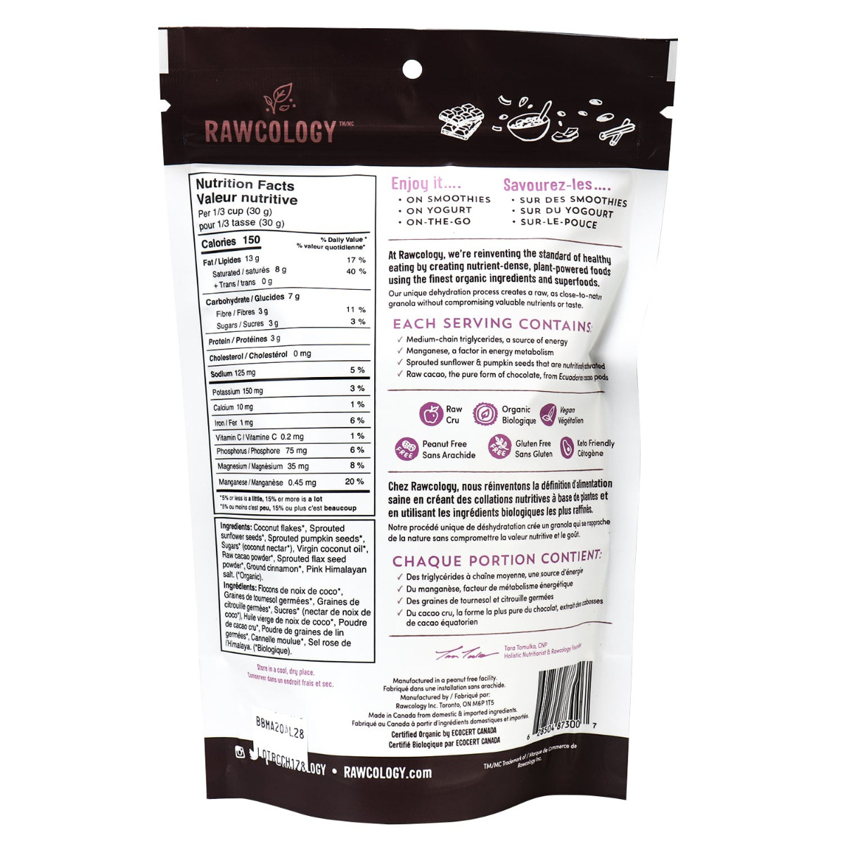 Rawcology's keto and paleo-friendly Chocolate Granola is organic, grain-free, gluten-free, and nut free. It’s packed with vegan chocolate coconut chips, activated sunflower seeds, activated pumpkin seeds, and lightly sweetened with coconut nectar, a low-glycemic sweetener. It only has 3 grams of sugar per serving, is a low net carb meal or snack, and is dehydrated at low temperatures for optimal nutrition and flavour. Enjoy it with milk, yogurt, or on-the-go!