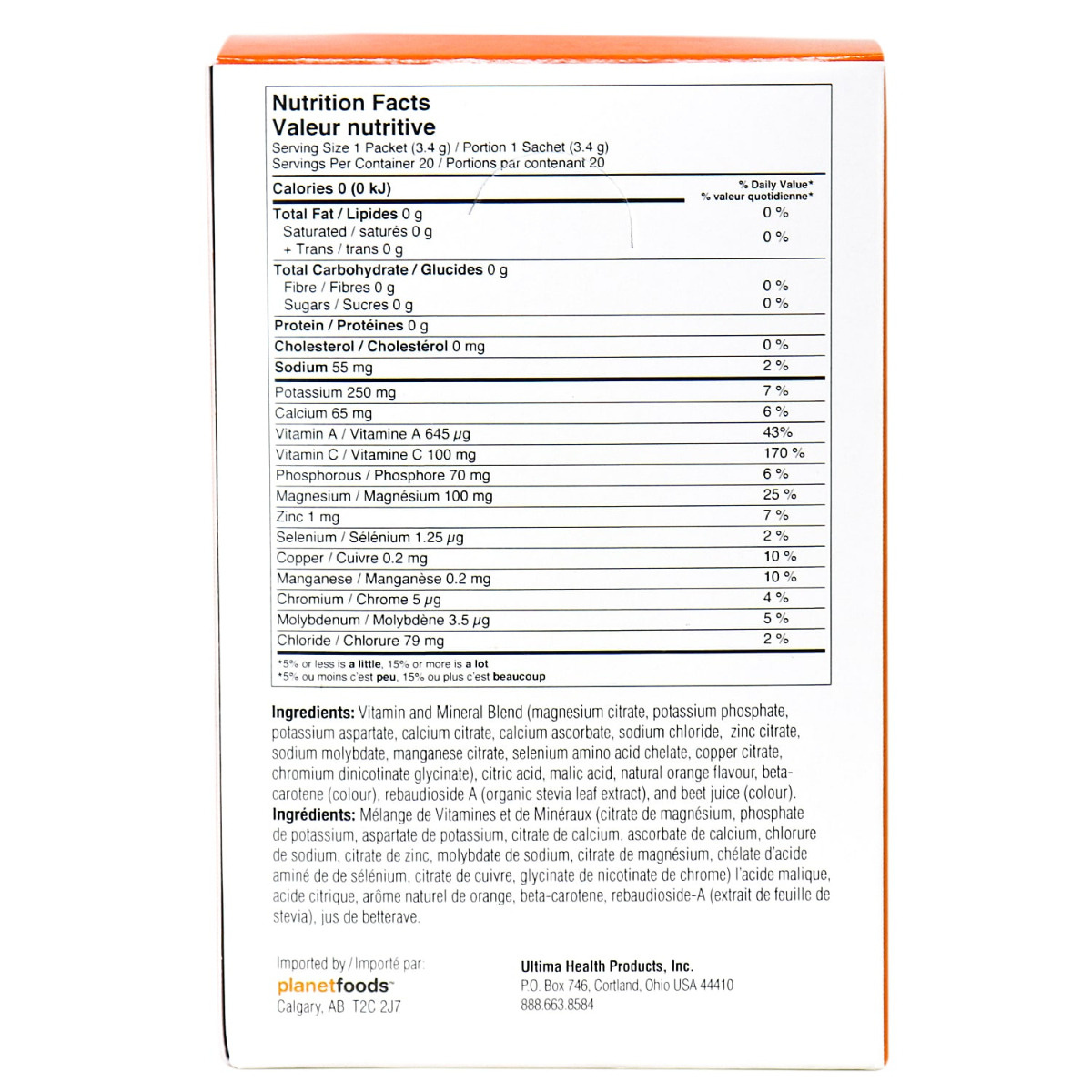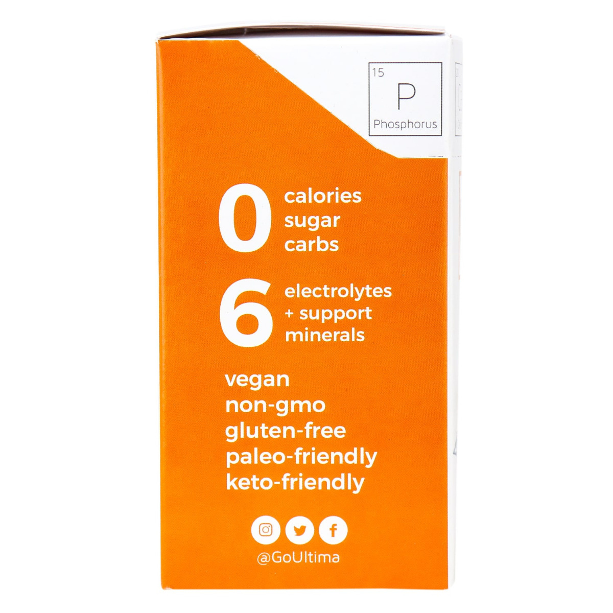 Ultima with orange flavour in stick packs contain a perfect balance of all 6 electrolytes plus support minerals that work together to provide complete hydration so you can feel and perform your best. Ultima is sweetened with stevia leaf and made with real fruit flavors that taste delicious.